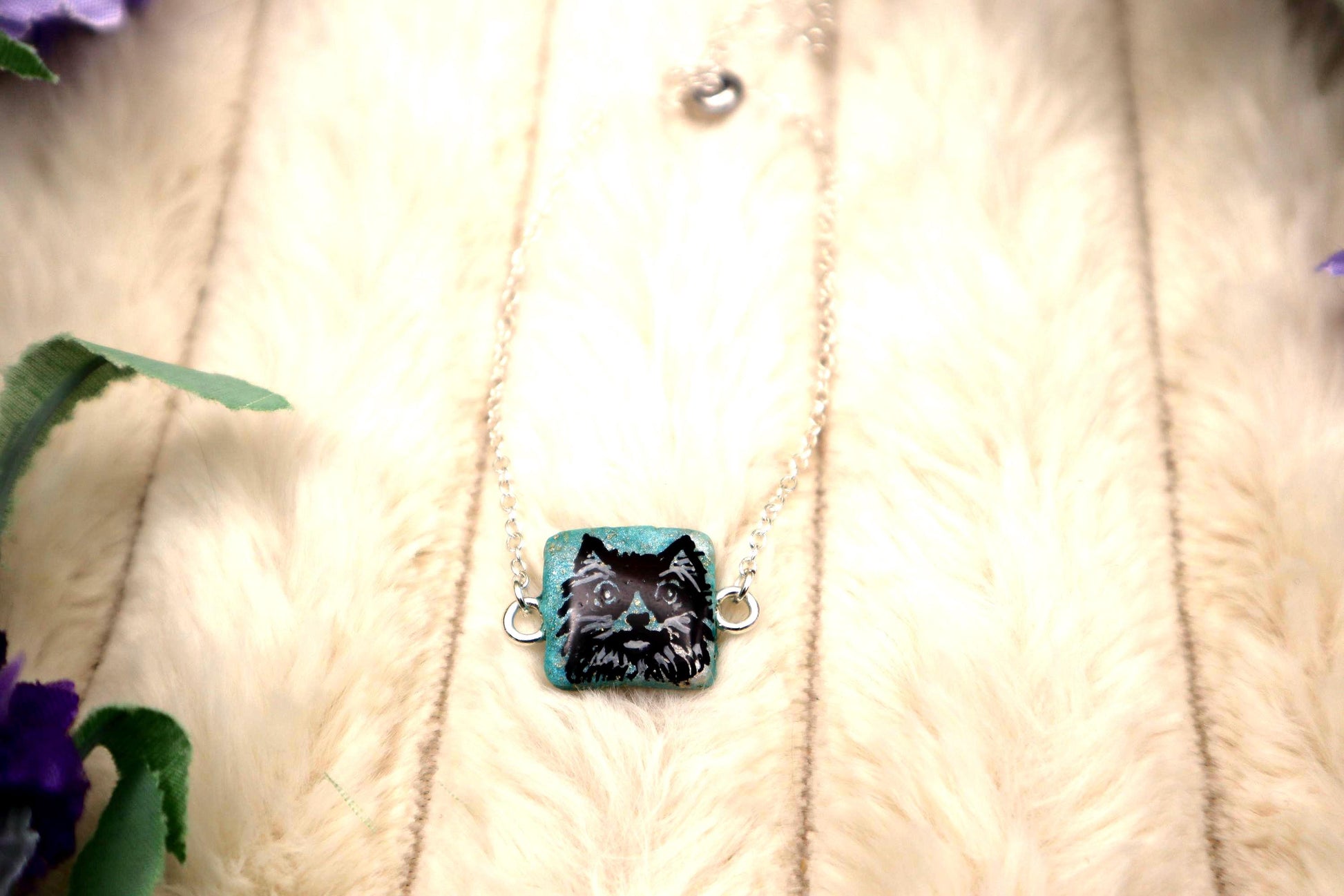 This pendant is made with polymer clay, acrylic paint, and UV resin. The pendant is about 0.5in tall, 0.5in wide, and about 5mm thick. This necklace is made with a stirling silver plated stainless steel 9.05in chain that has an adjustable clasp.