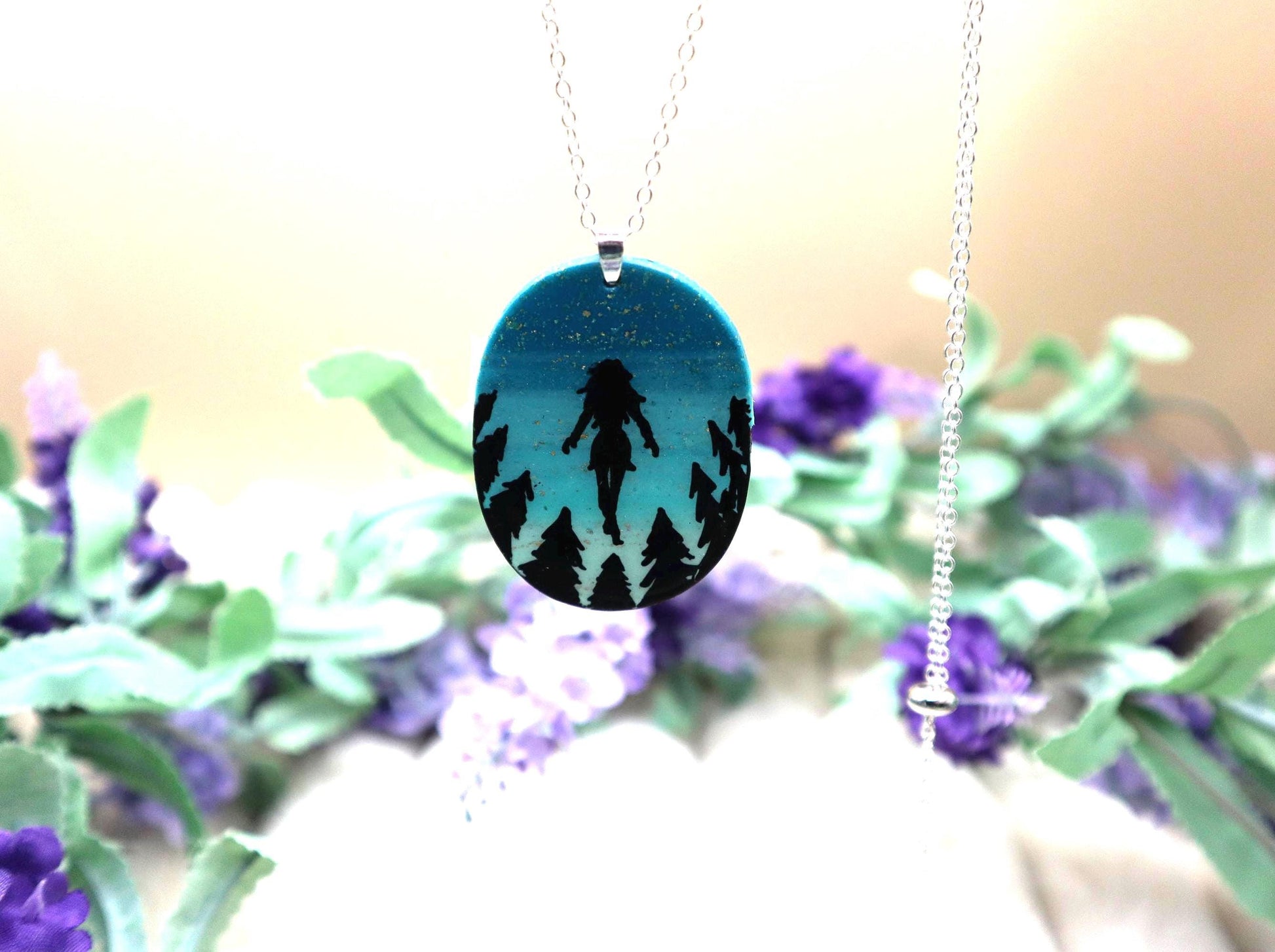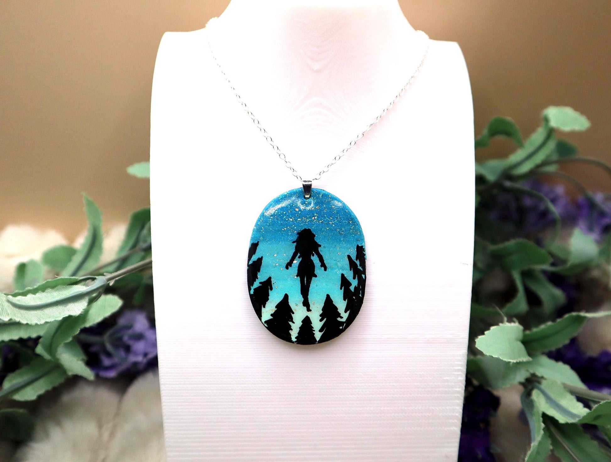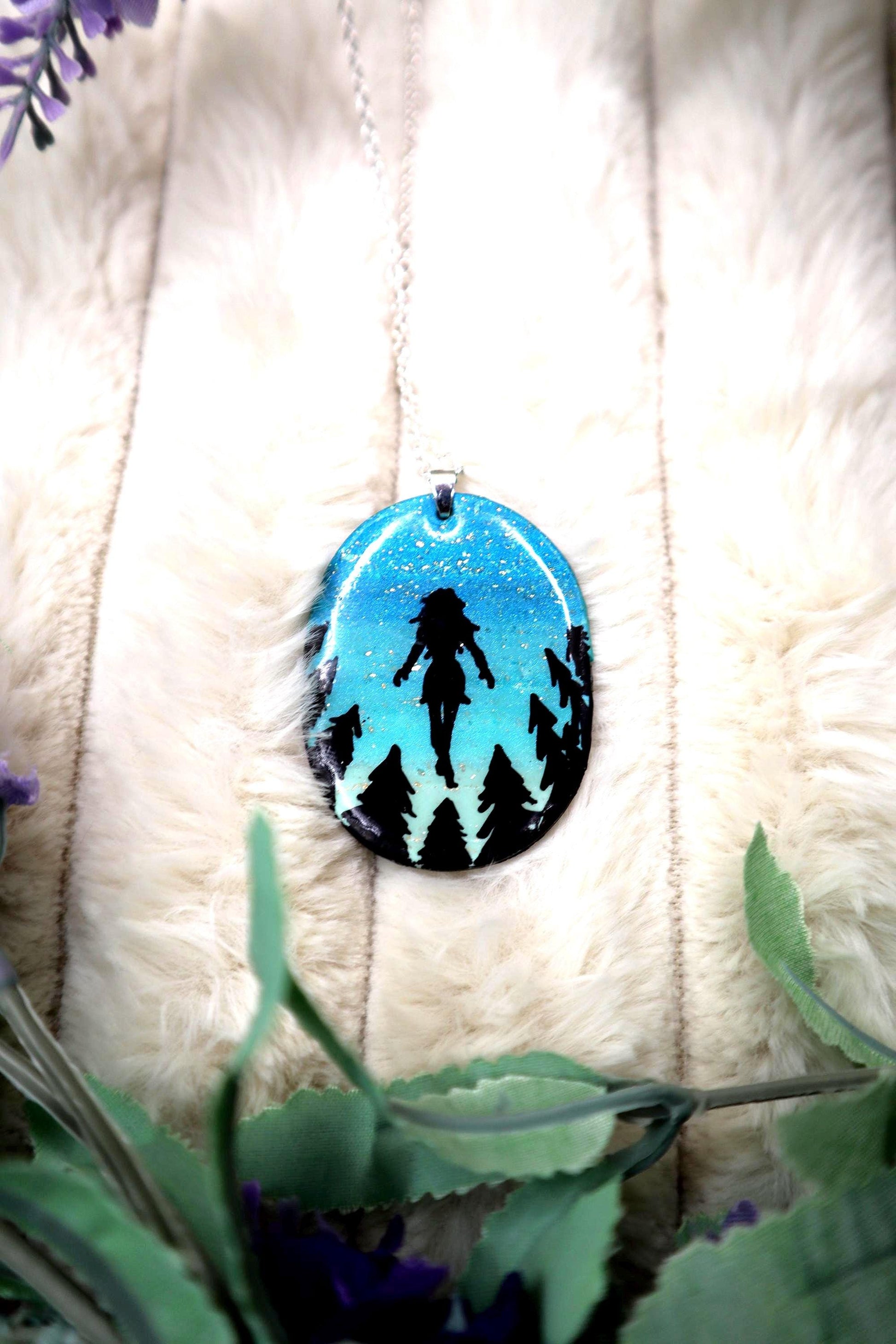 This pendant is made with polymer clay, acrylic paint, and UV resin. The pendant is about 2in tall, 1.5in wide, and about 2mm thick. This necklace is made with a stirling silver plated stainless steel 30in chain that has an adjustable clasp.