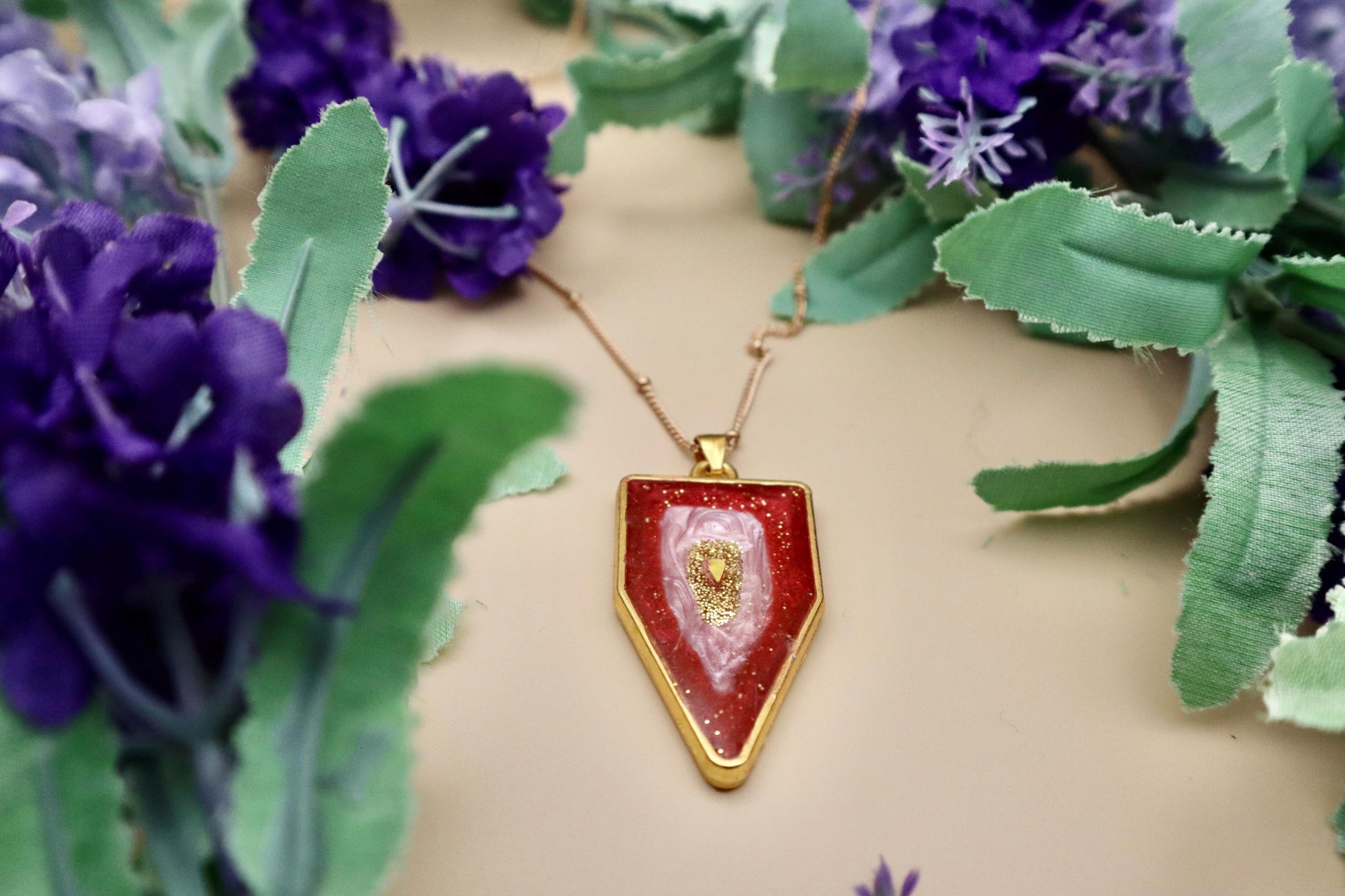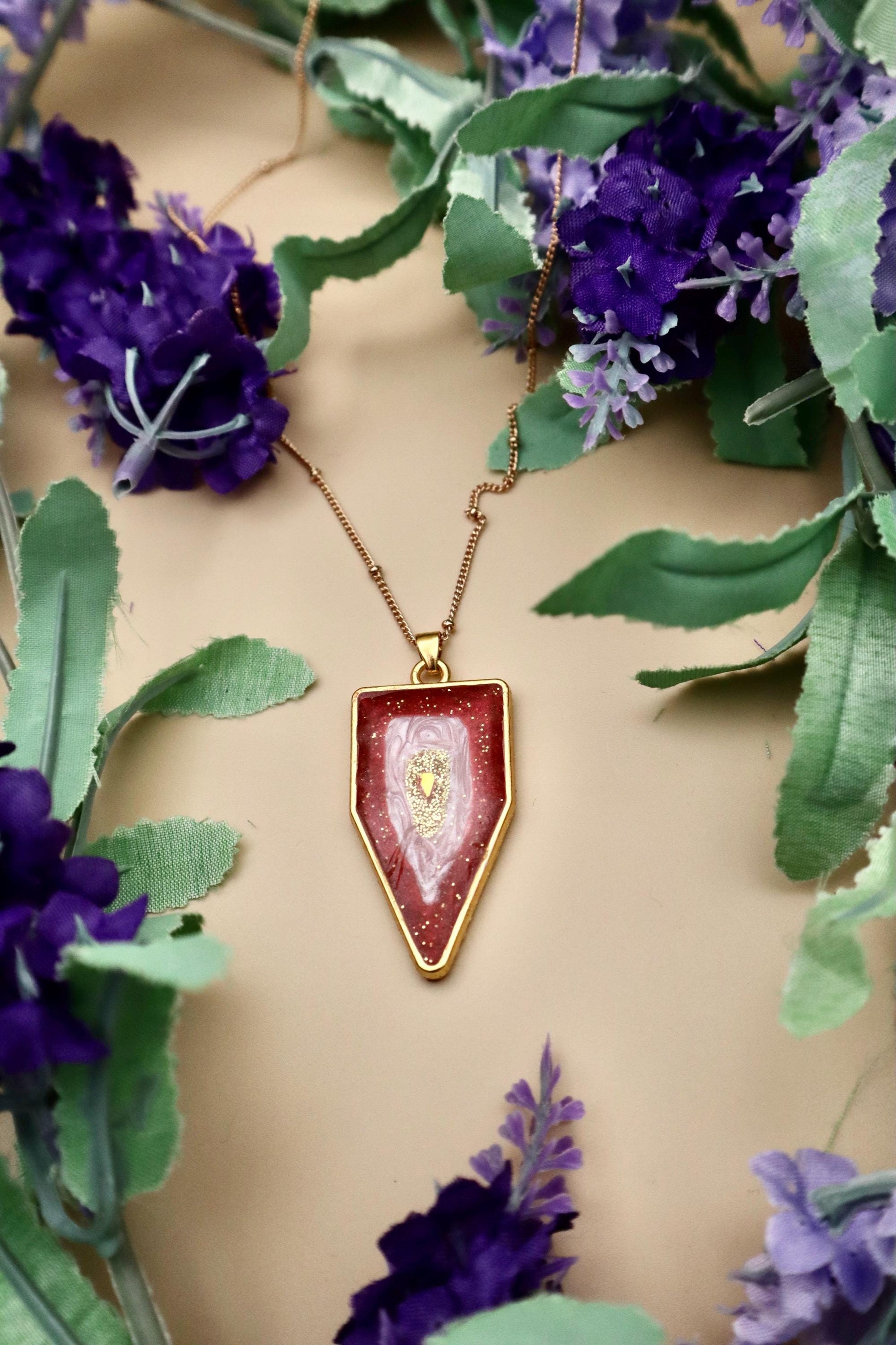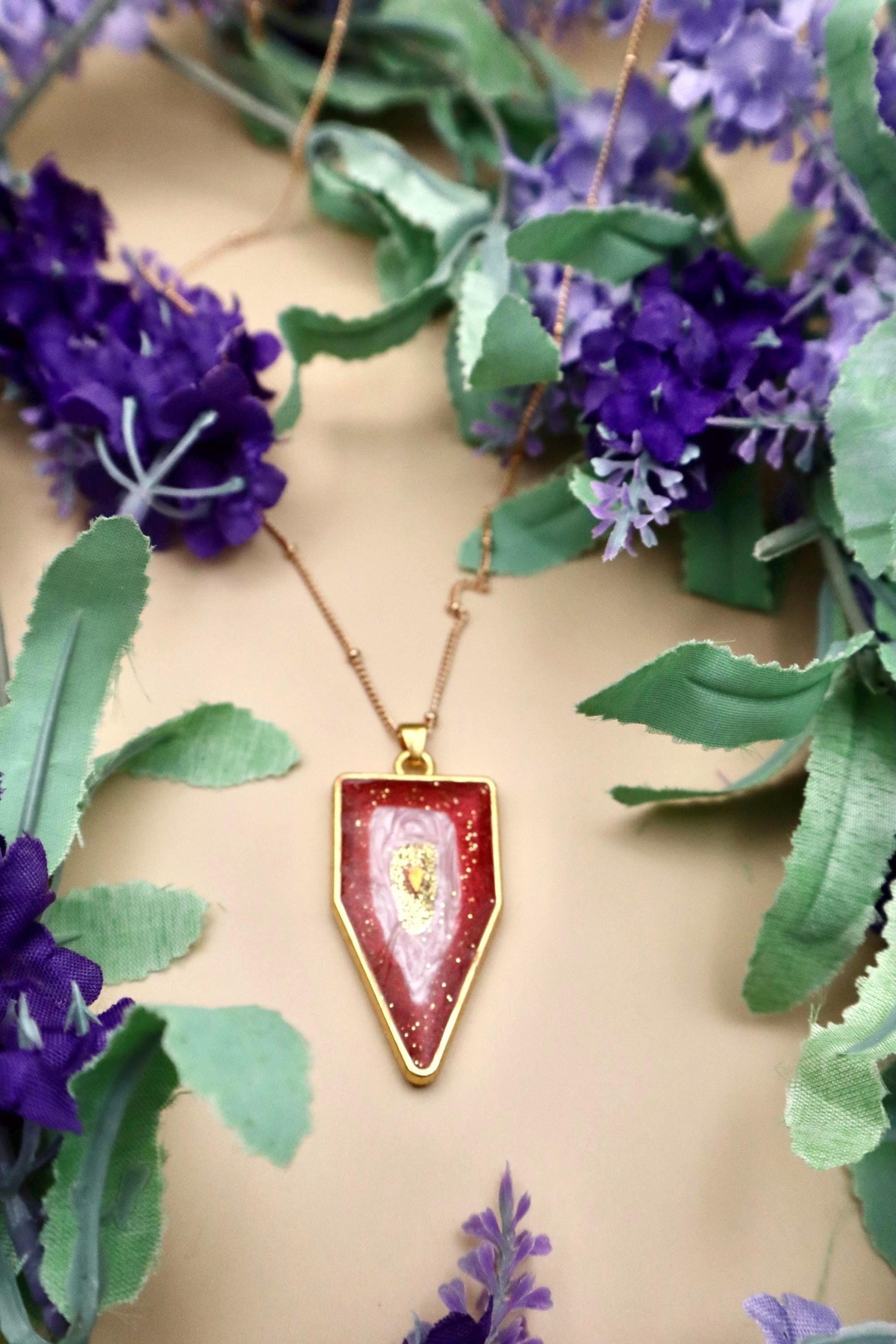 This Geode Pendant is made from UV Resin, and gold plated copper. The pendant is about 35mm tall and 20mm wide. It comes with a long gold nickel free chain that is 30in around and 1.4mm wide.