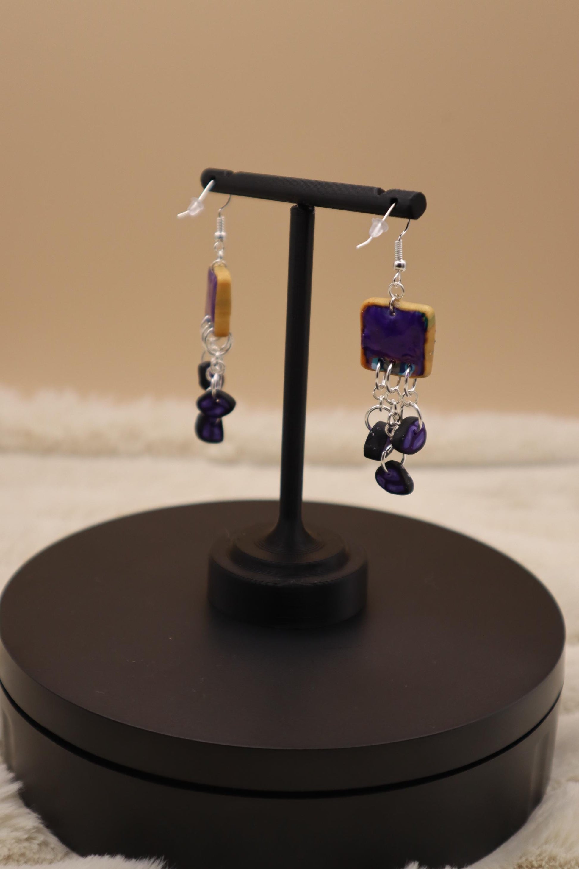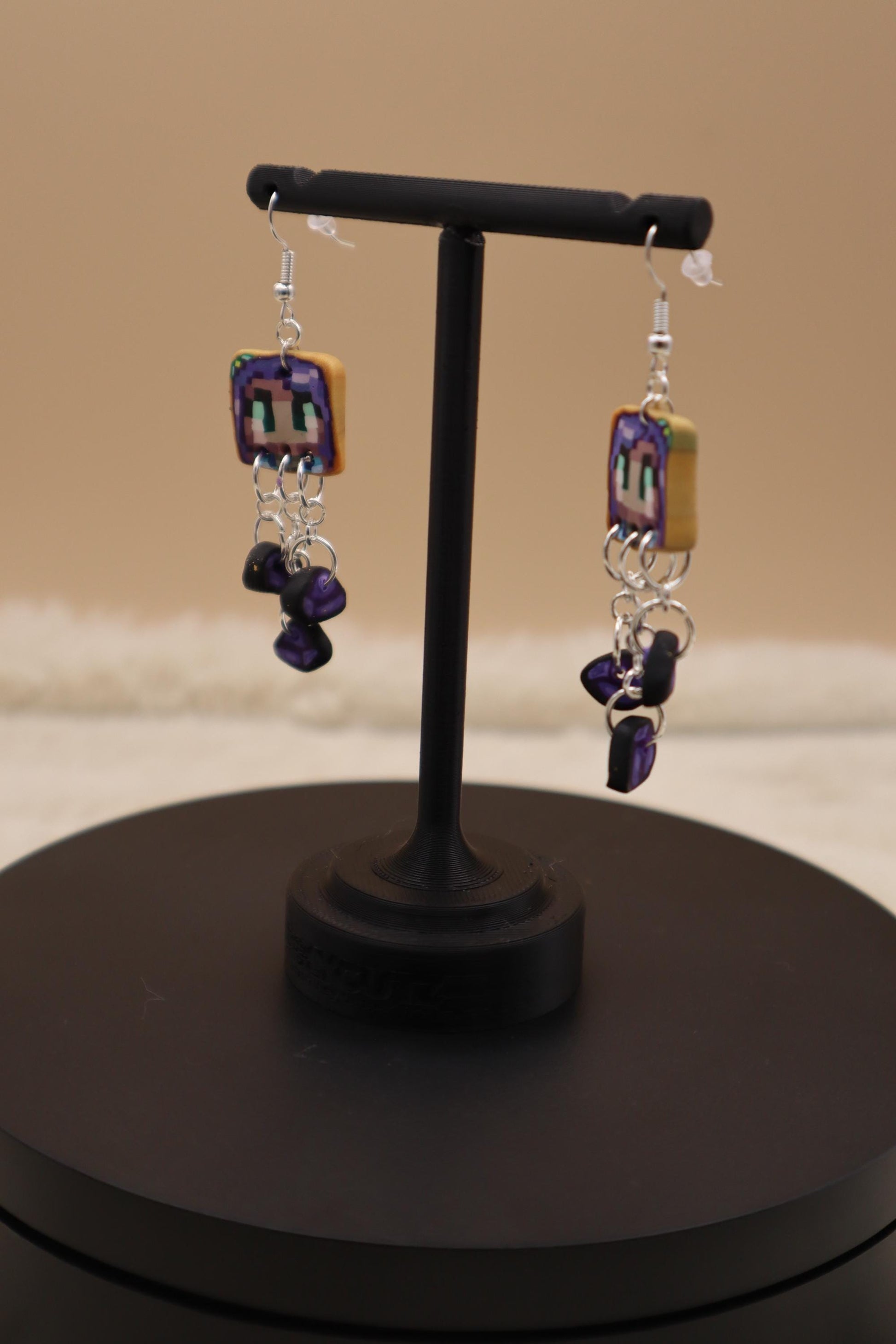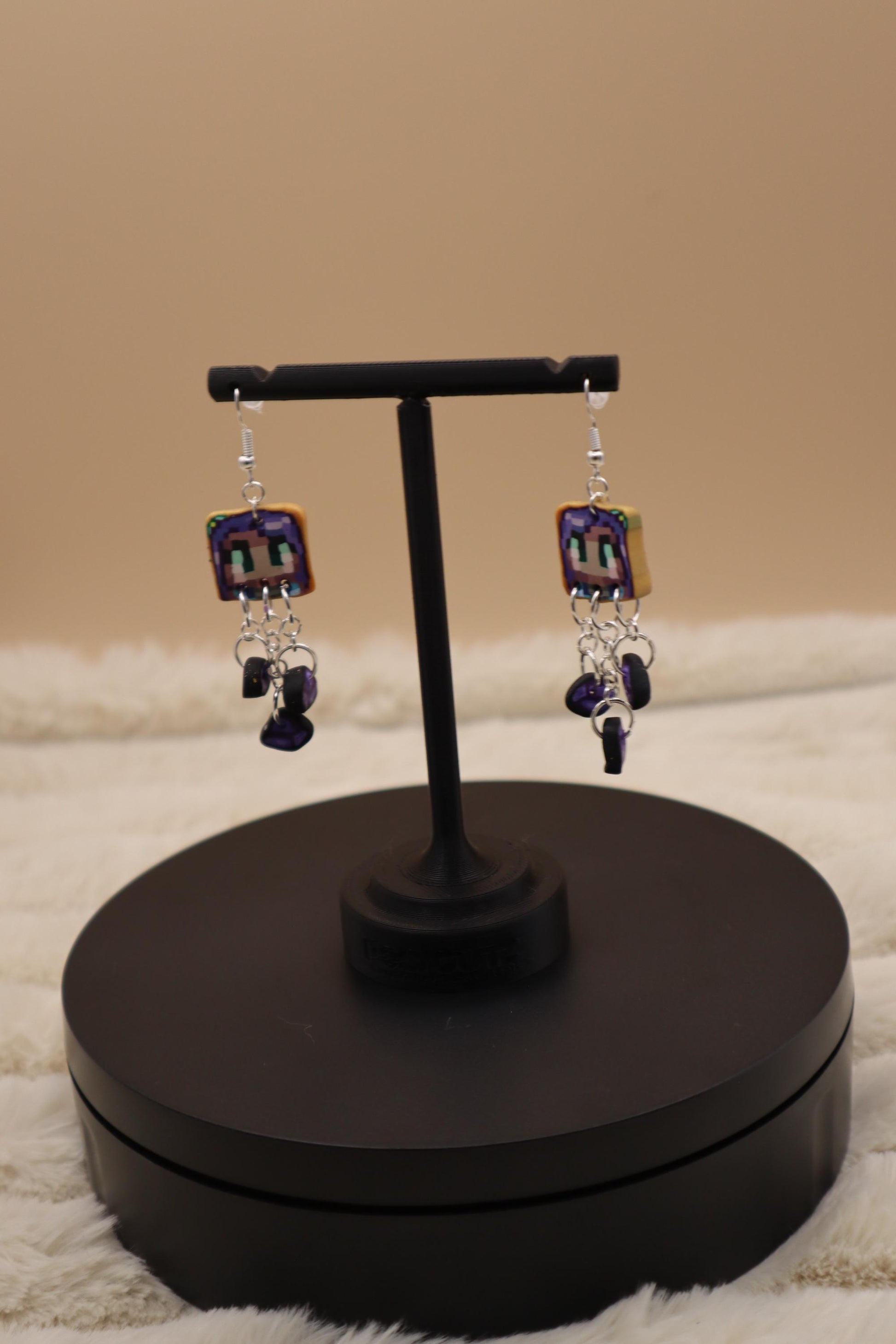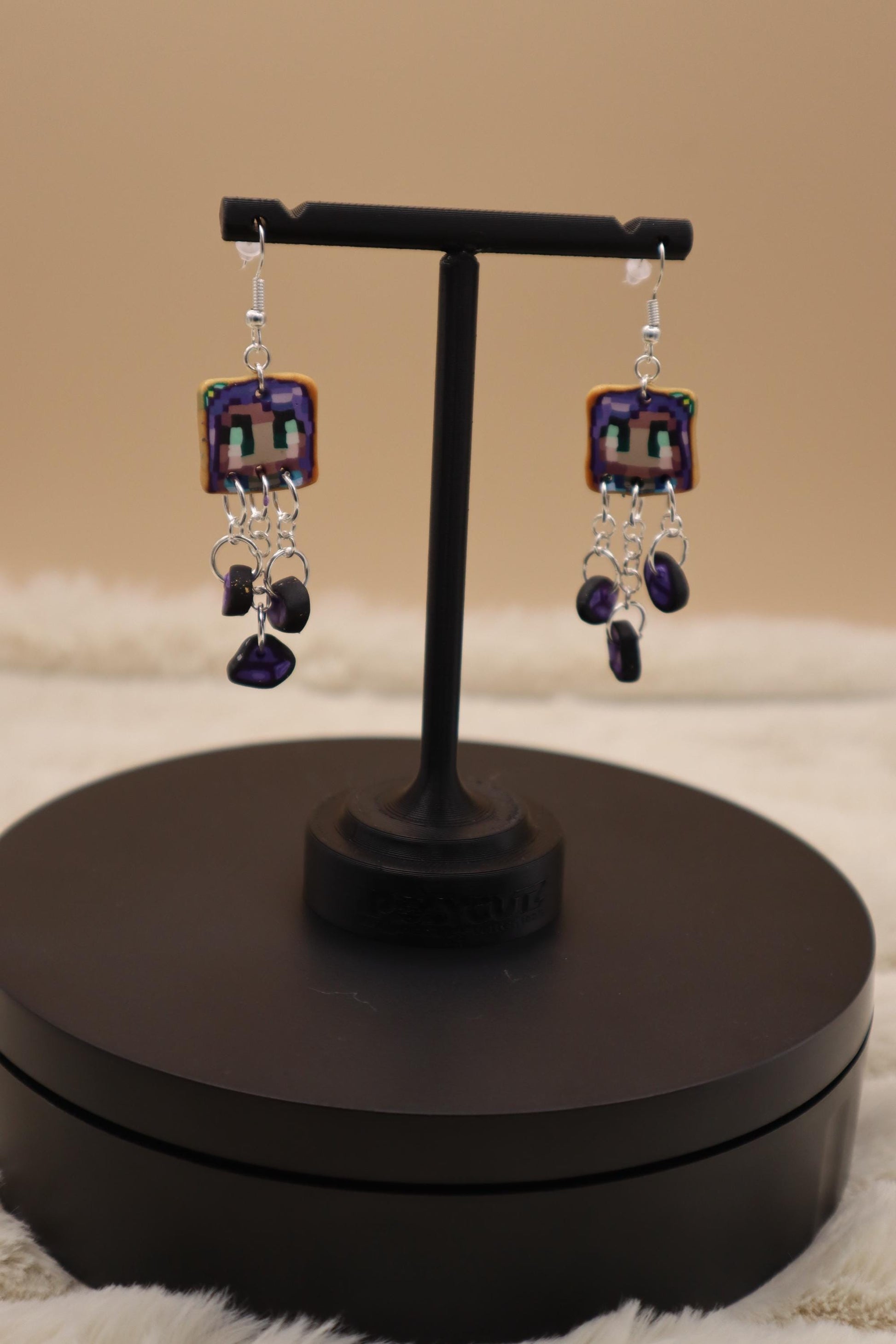 These Stardew Valley inspired Abigail earrings were made with polymer clay, UV resin, and steel. The charms are about 46mm tall with the dangling amethyst beads. The earrings dangle at around 70mm and come with metal backs.
